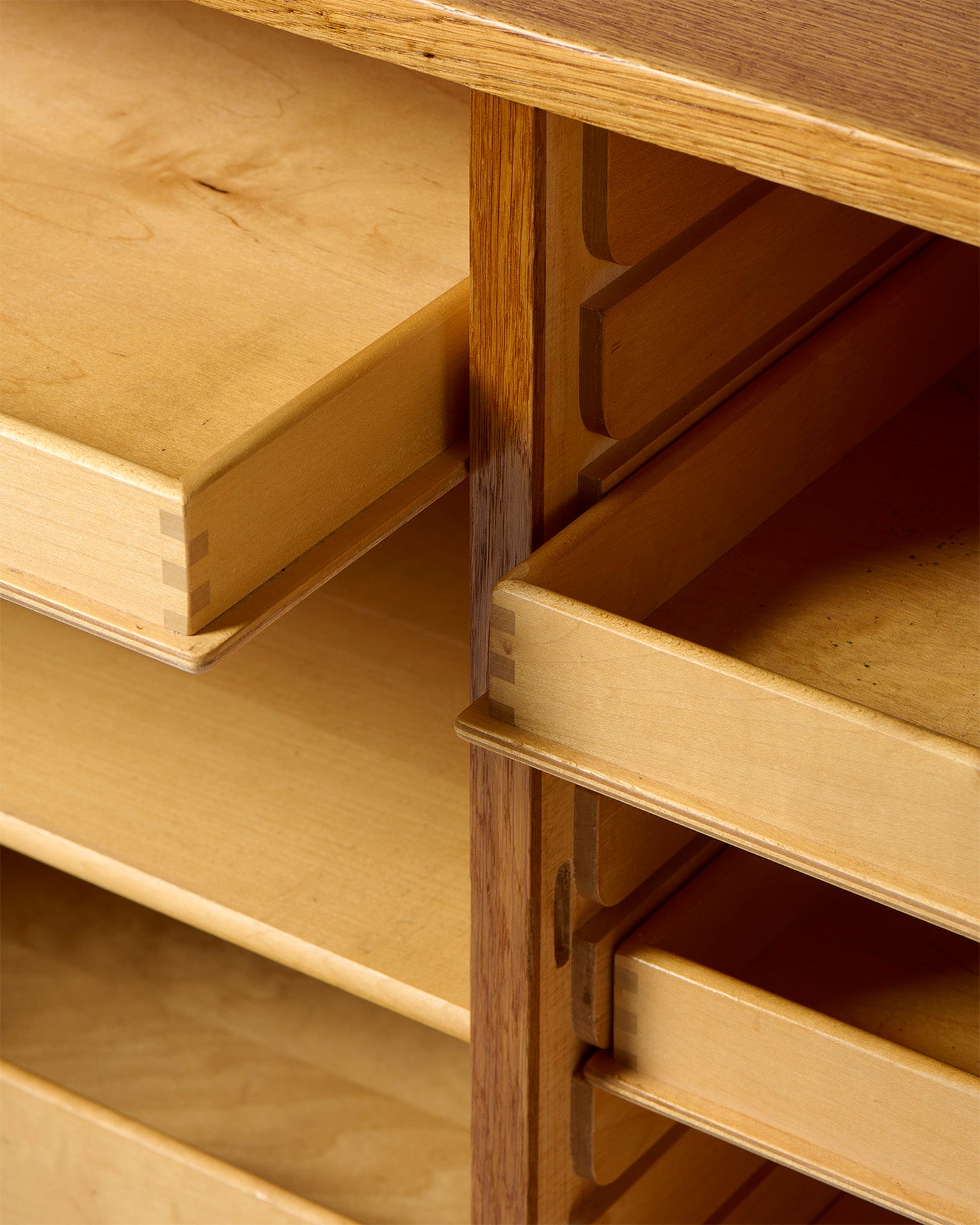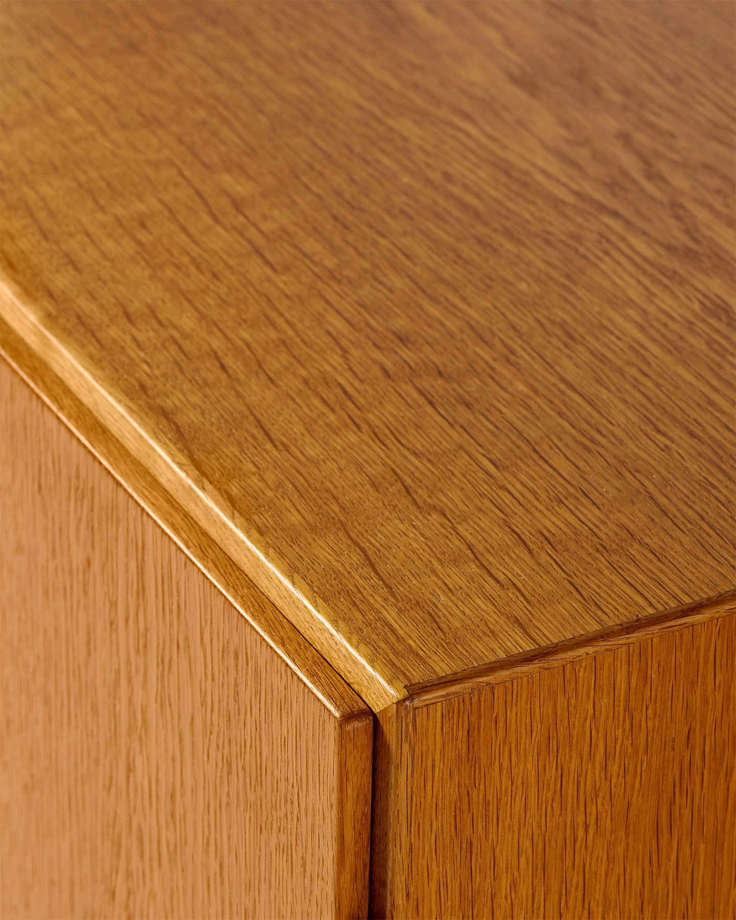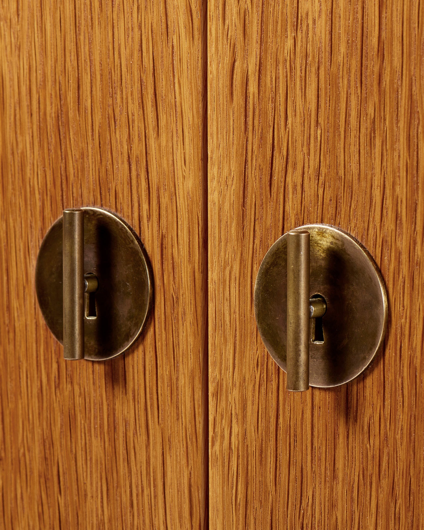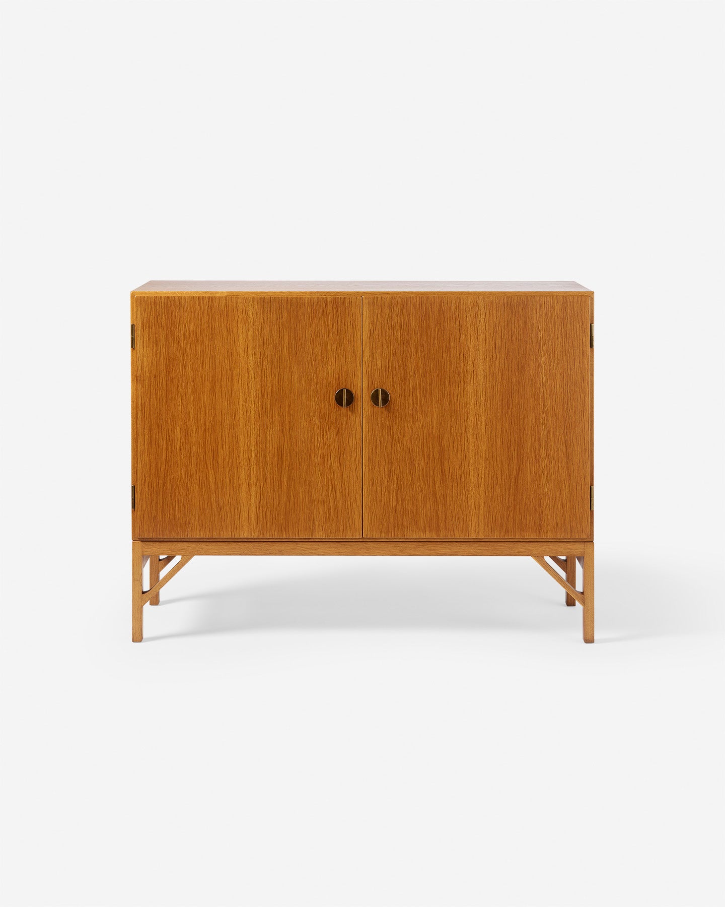 An oak example of the Model A-232 Cabinet, designed by Borge Mogensen in 1951 for cabinetmaker Carl Marius Madsen based near Odense in Denmark. Madsen also worked with Mogensen's close friend Hans Wegner and was known for high-quality dining chairs and cabinets. Madsen's productions including the China Cabinet were distributed as part of the FDB Mobler group for whom Mogensen had held the position of design director through the 1940s.