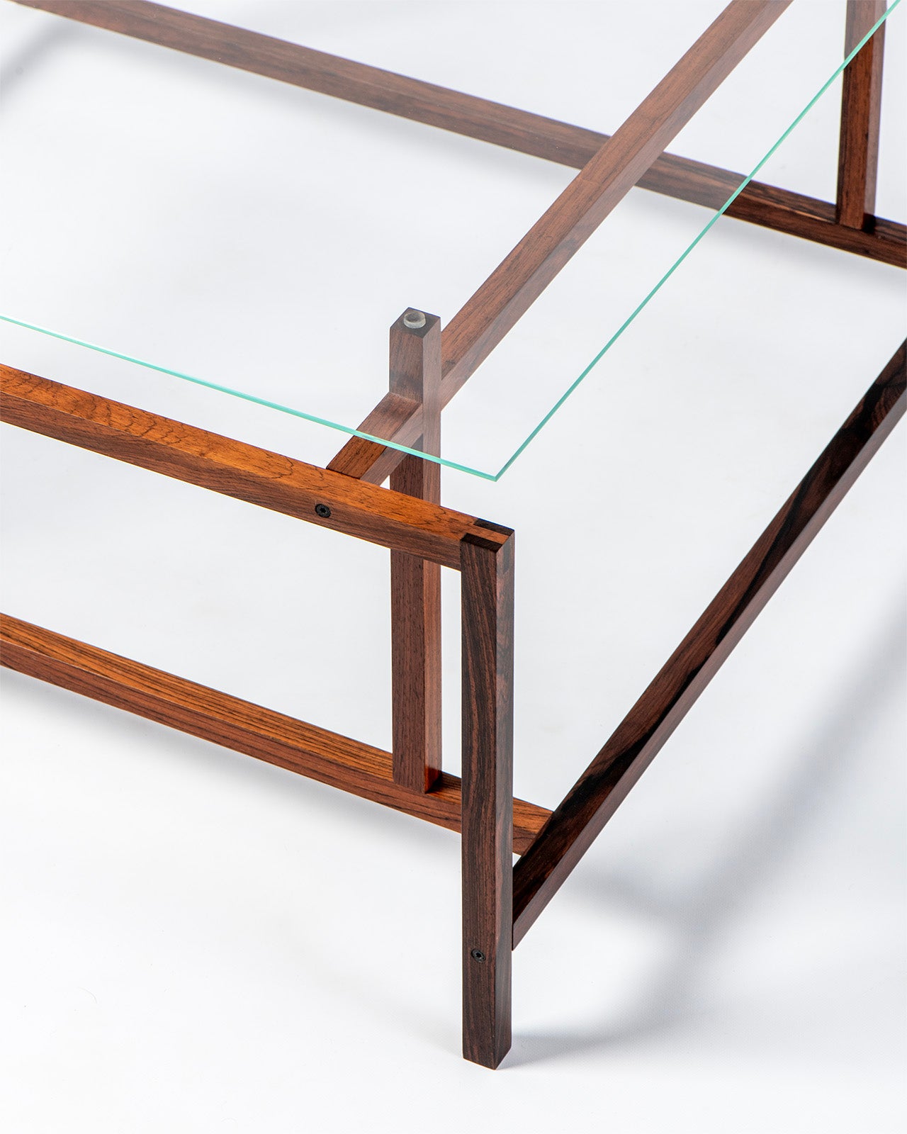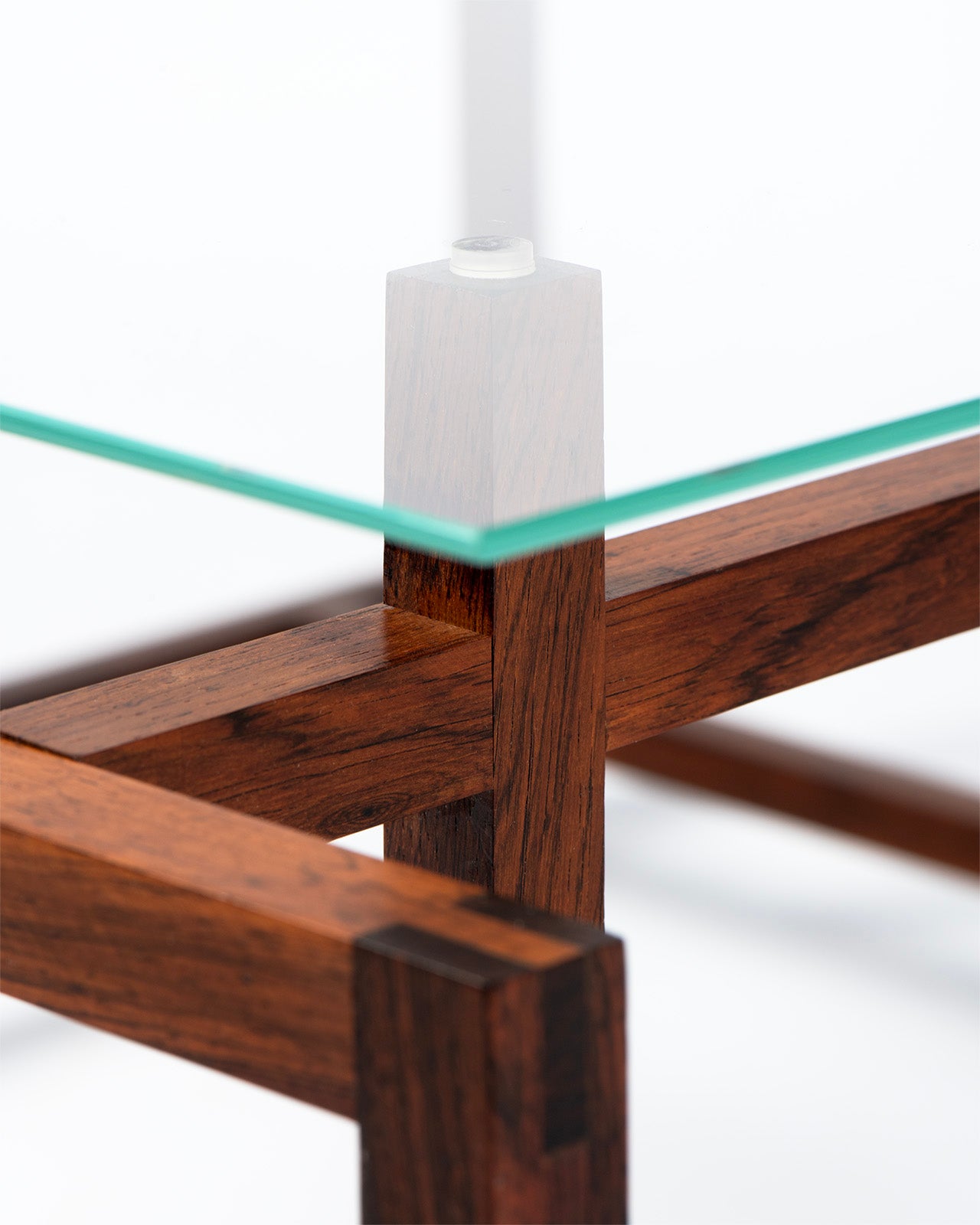 This example is 80cm square with rosewood frame and new glass top. A pair is available by request as well complimentary 50cm square side tables from the same series.