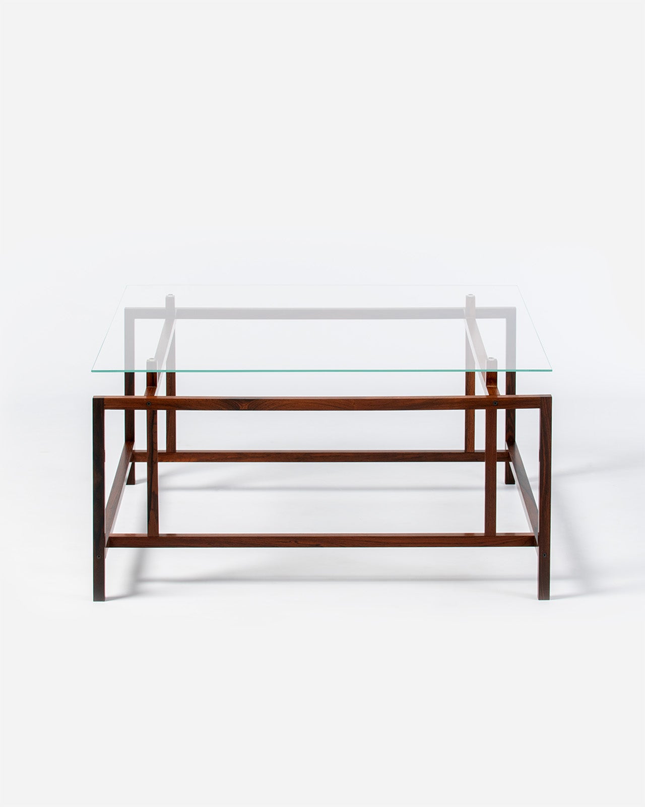 A striking, modernist coffee table from lesser-known Danish designer Henning Norgaard. This series was produced in a variety of sizes all with architectural frame and floating glass top by Danish factory Komfort. They were known for their productions for Danish designers including Arne Hovmand Olsen and Arne Wahl Iversen in the 1960s