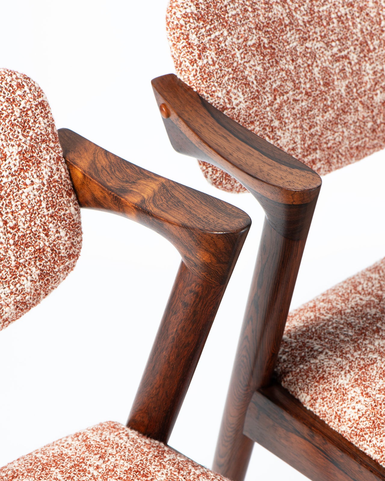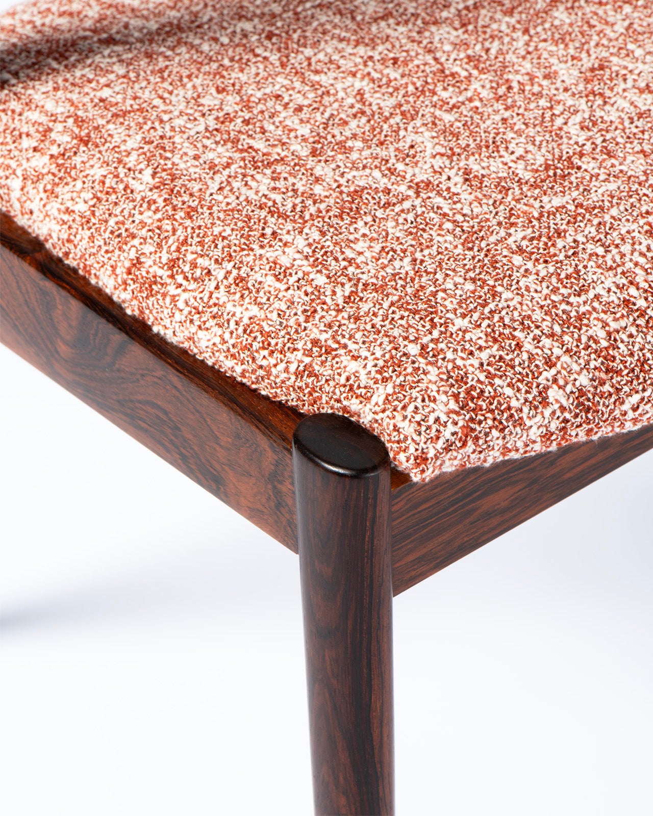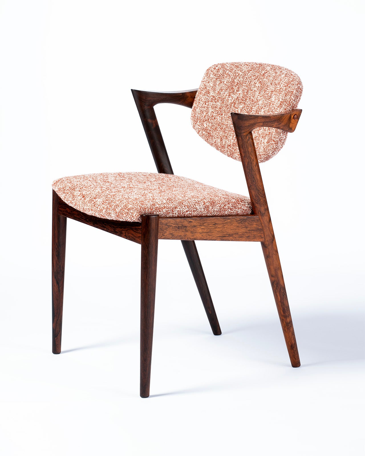 Kai Kristiansen's iconic Model 42 dining chairs, produced by cabinetmaker Villy Schou Andersen in Denmark and designed in 1956. These examples have refinished rosewood frames with seat and back reupholstered in Sahco Zero textured fabric. The back pad has a tilt function for added comfort. Larger sets and different upholstery options including COM are available by request.