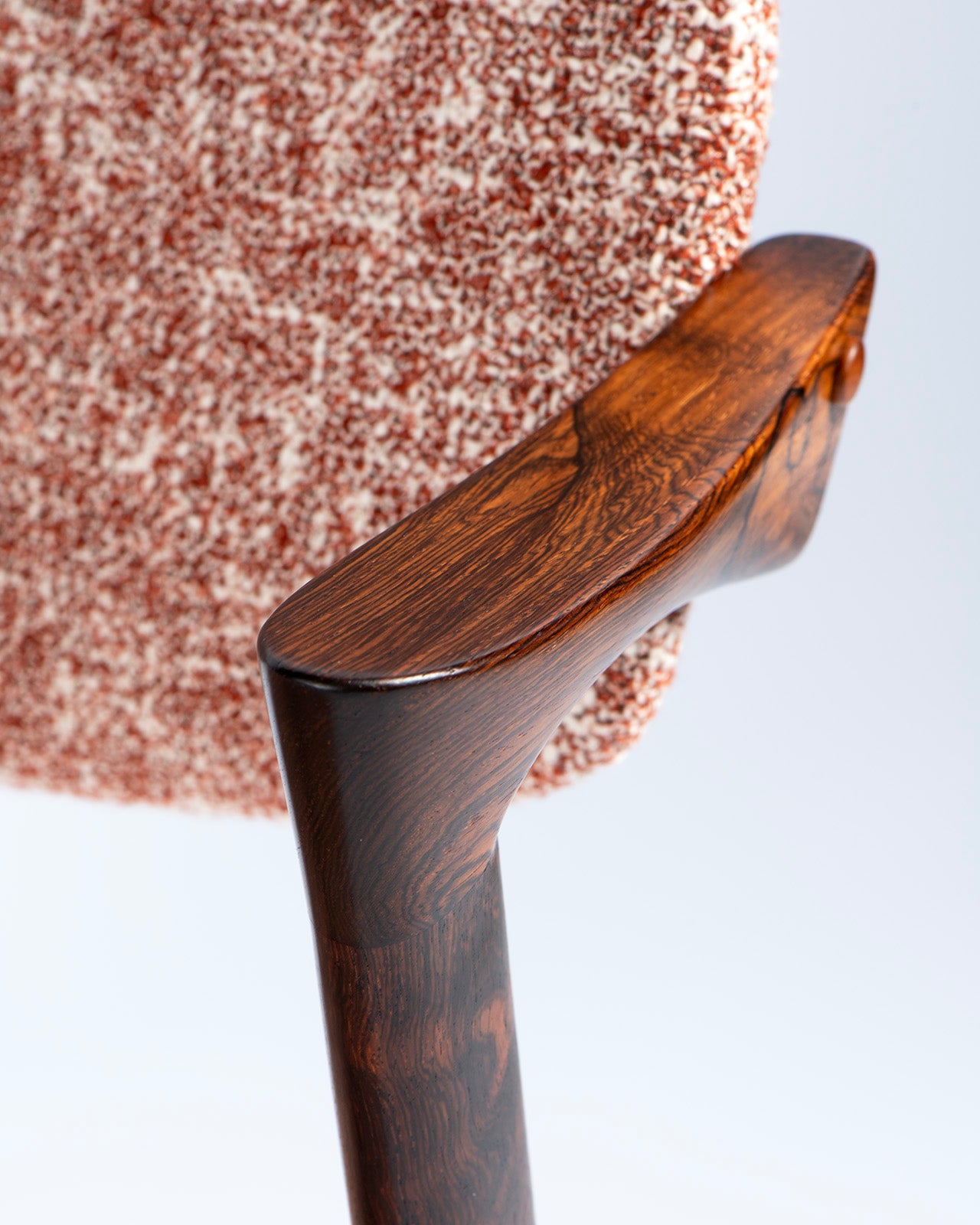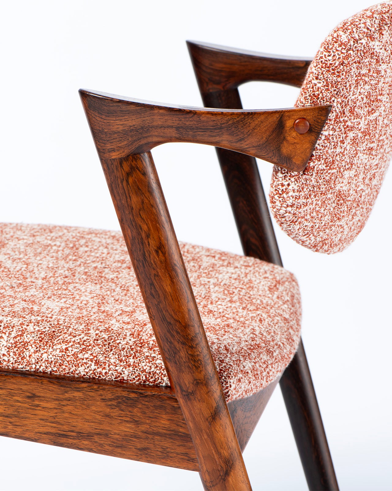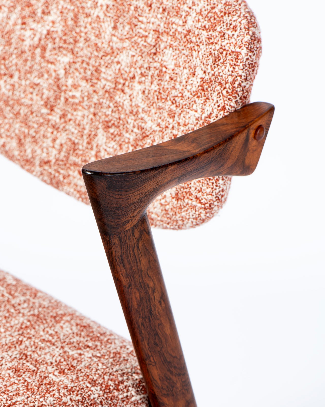 Kai Kristiansen's iconic Model 42 dining chairs, produced by cabinetmaker Villy Schou Andersen in Denmark and designed in 1956. These examples have refinished rosewood frames with seat and back reupholstered in Sahco Zero textured fabric. The back pad has a tilt function for added comfort. Larger sets and different upholstery options including COM are available by request.