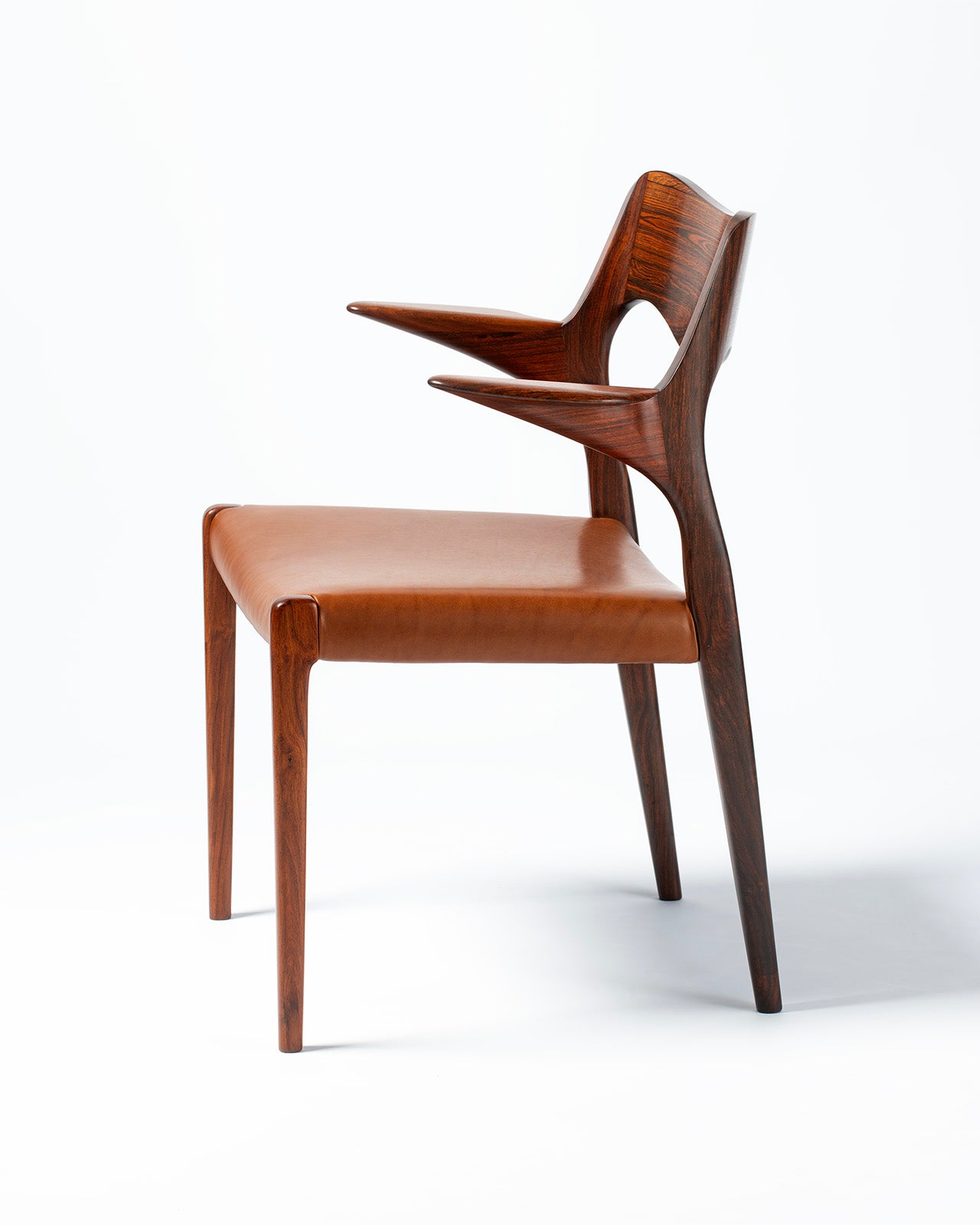 Niels Moller's Model 55 armchair was one of his earliest and most expressive works, designed in 1951 in the early days of operating his own factory: J.L. Moller Mobelfabrik in Odense, Denmark. The Model 55 and its armless companion the Model 71 evolved from Moller's collaborative design work early in his career with architect Arne Hovmand-Olsen which were displayed furniture fairs such as Tidens Mobler Copenhagen and Mobelmessen Fredericia.