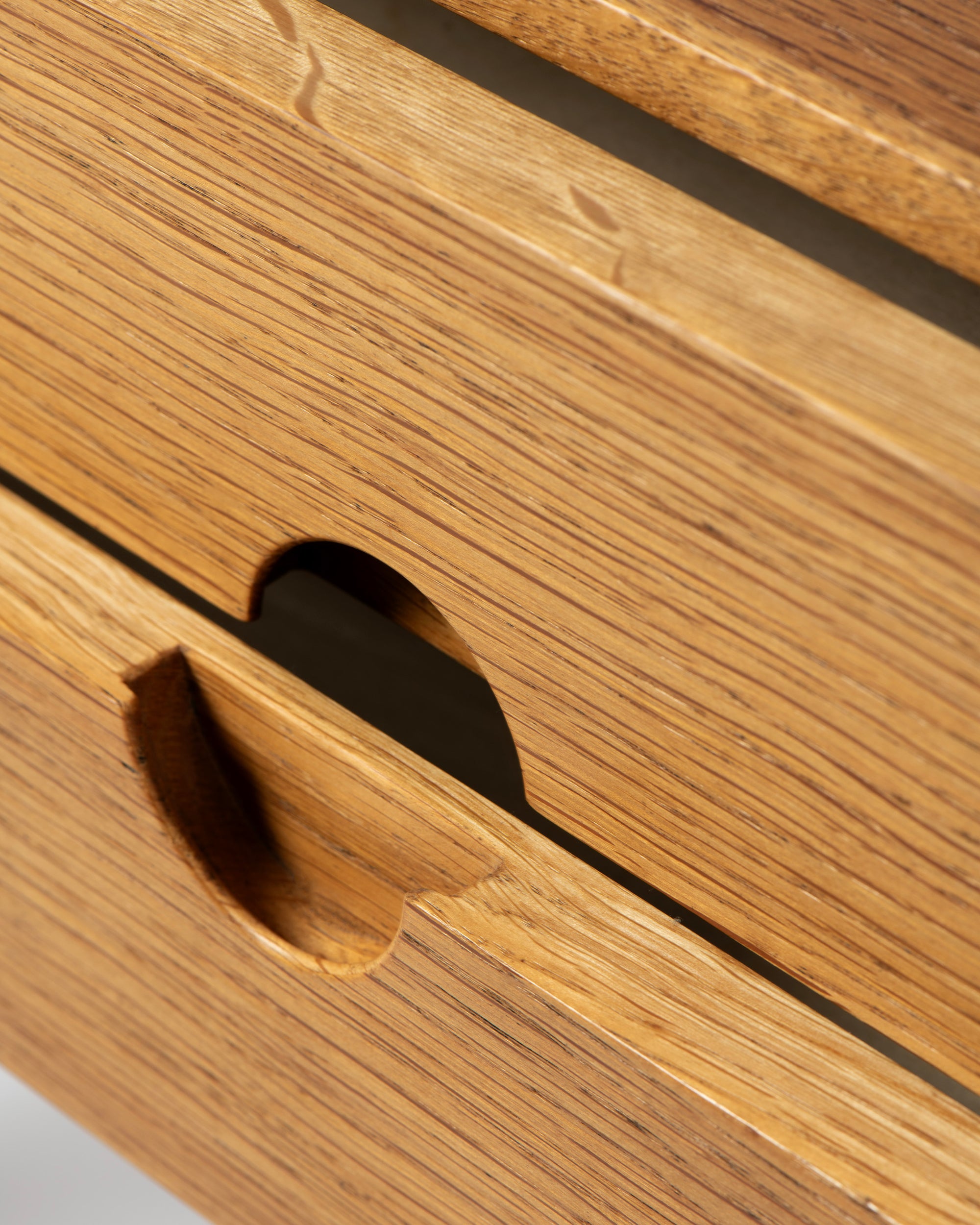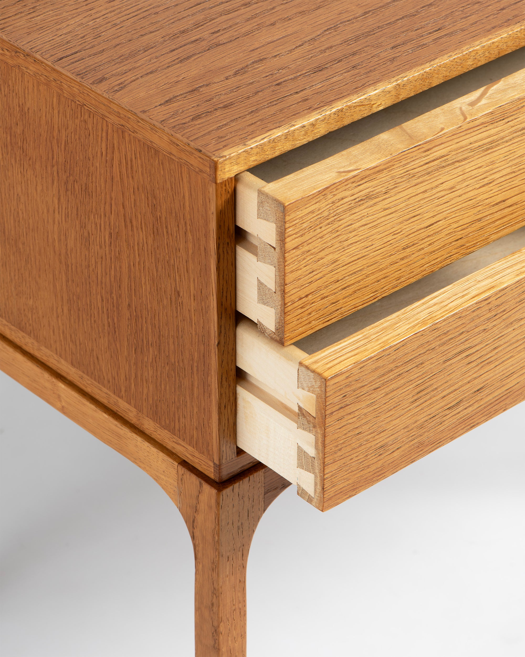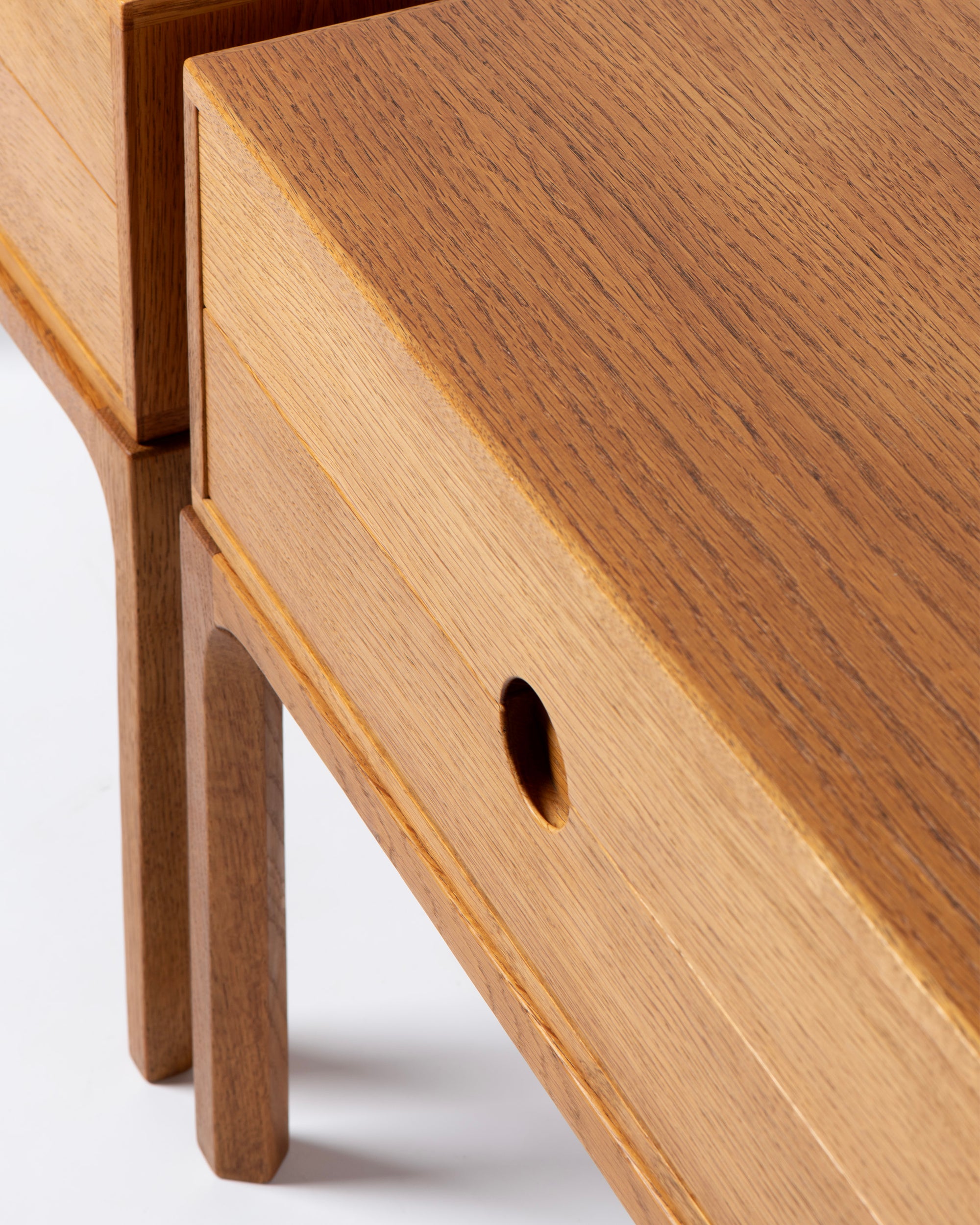 A pair of model 384 bedside tables in oak, produced by Aksel Kjersgaard in Odder, Denmark c1950s. This model is one of Kristiansen's most well-known and popular designs and comes from the Entre series of tables and chests all featuring his signature half-moon drawer pulls.