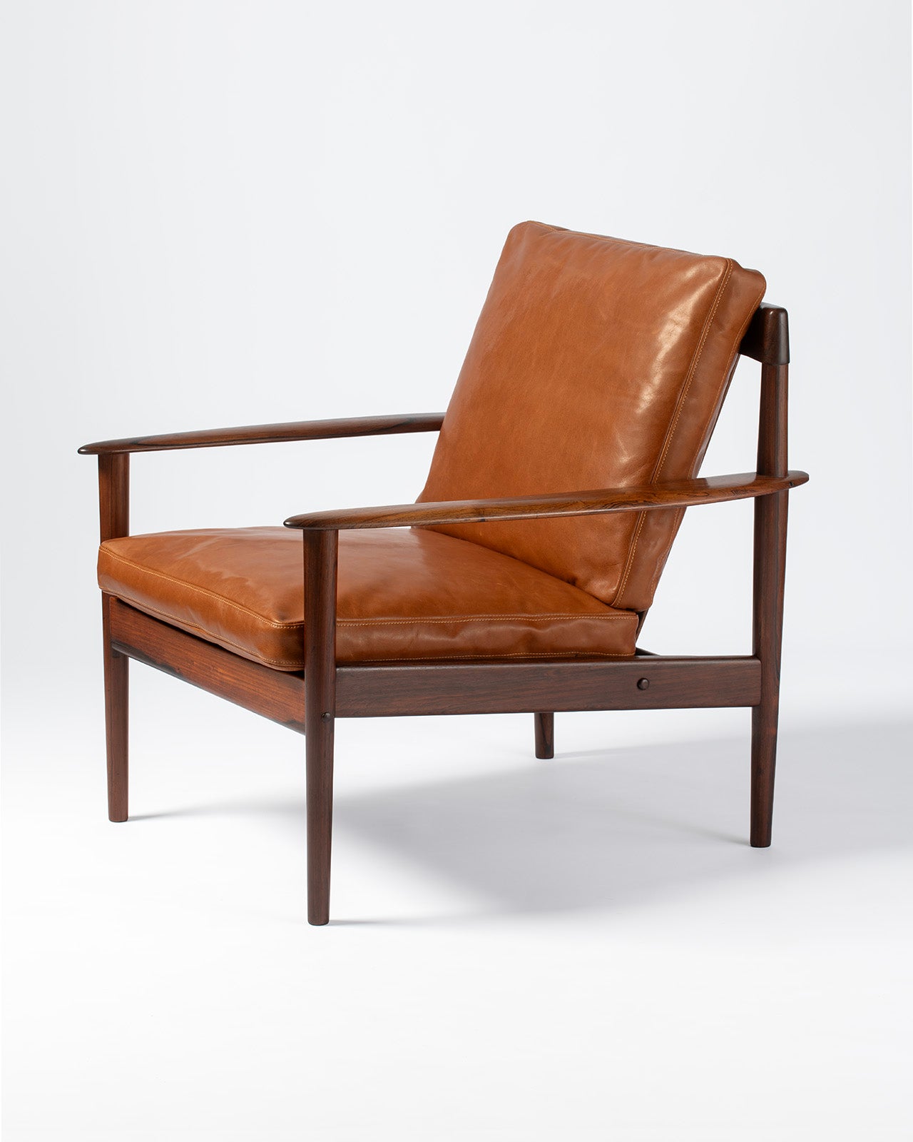 A beautiful lounge chair designed by Grete Jalk for cabinetmaker Poul Jeppesen in Denmark in 1956. This example comes in stunning rosewood with new feather-filled cushions reupholstered in aniline cognac brown leather. The Model 56 lounge chair debuted at the Fredericia Furniture Fair in 1957 and became a great success for Jeppesen's company over the following years.