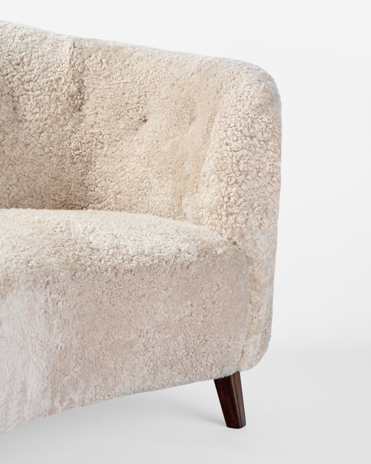 A uniquely shaped loveseat sofa, produced by a Danish Cabinetmaker in the 1940s with striking scalloped back shape and wrap-around arms. The sofa has been totally refurbished at our London workshops with new padding and reupholstery in premium Australian sheepskin.